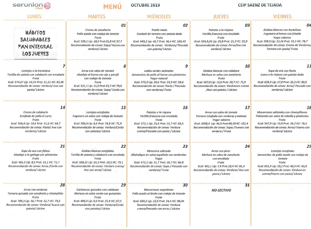 MENÚ ESCOLAR OCTUBRE 2019