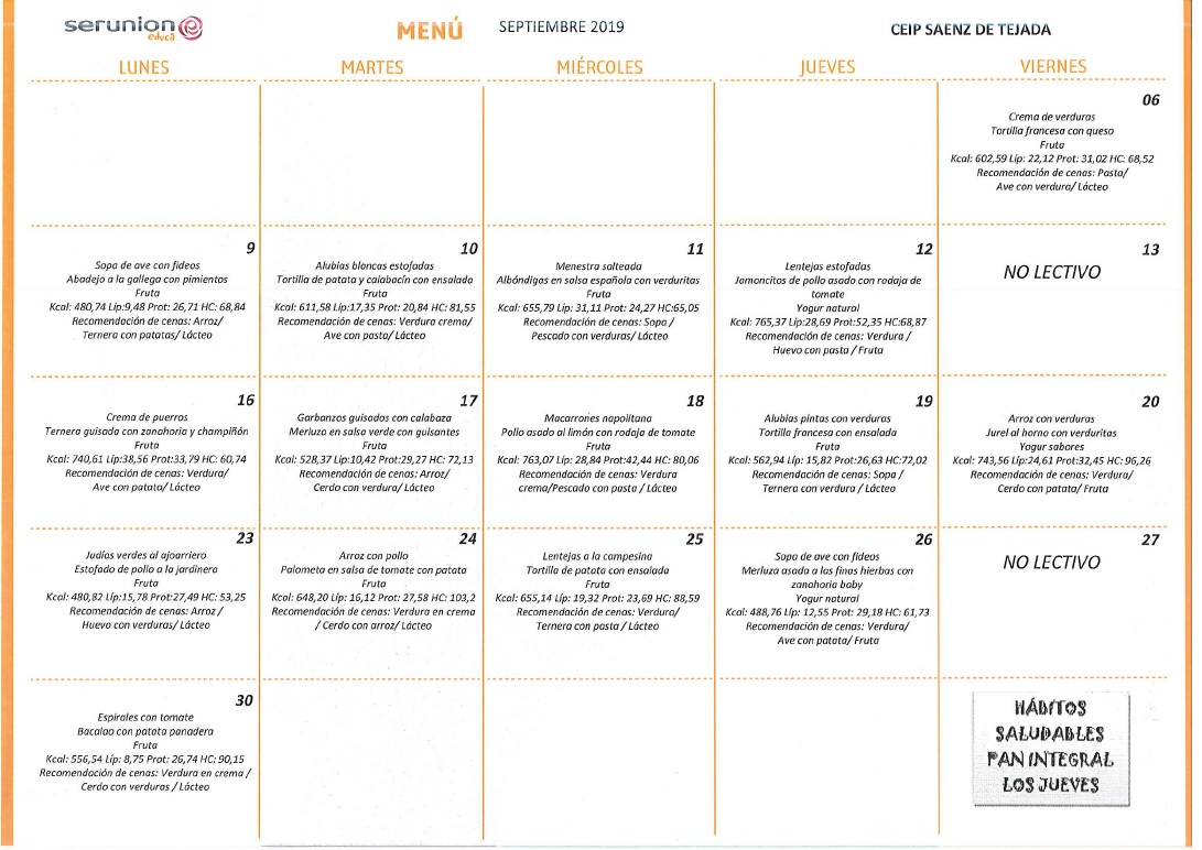 MENÚ ESCOLAR SEPTIEMBRE 2019